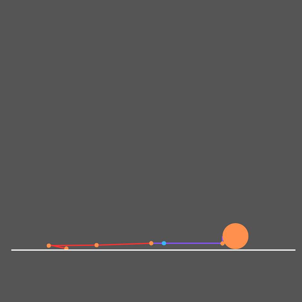 Do you remember the stick figures I introduced in the previous section? You can only produce force in the direction of the line connecting your feet to your centre of mass. You’d need to be lying flat on the ground to be close to achieving this. And you don’t need me to tell you why this can’t work!
